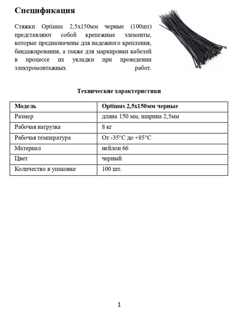 Стяжки Optimus 2,5x150мм черные (100шт) представляют собой крепежные элементы, которые предназначены для надежного крепления, бандажирования, а также для маркировки кабелей в процессе их укладки при проведении электромонтажных работ.