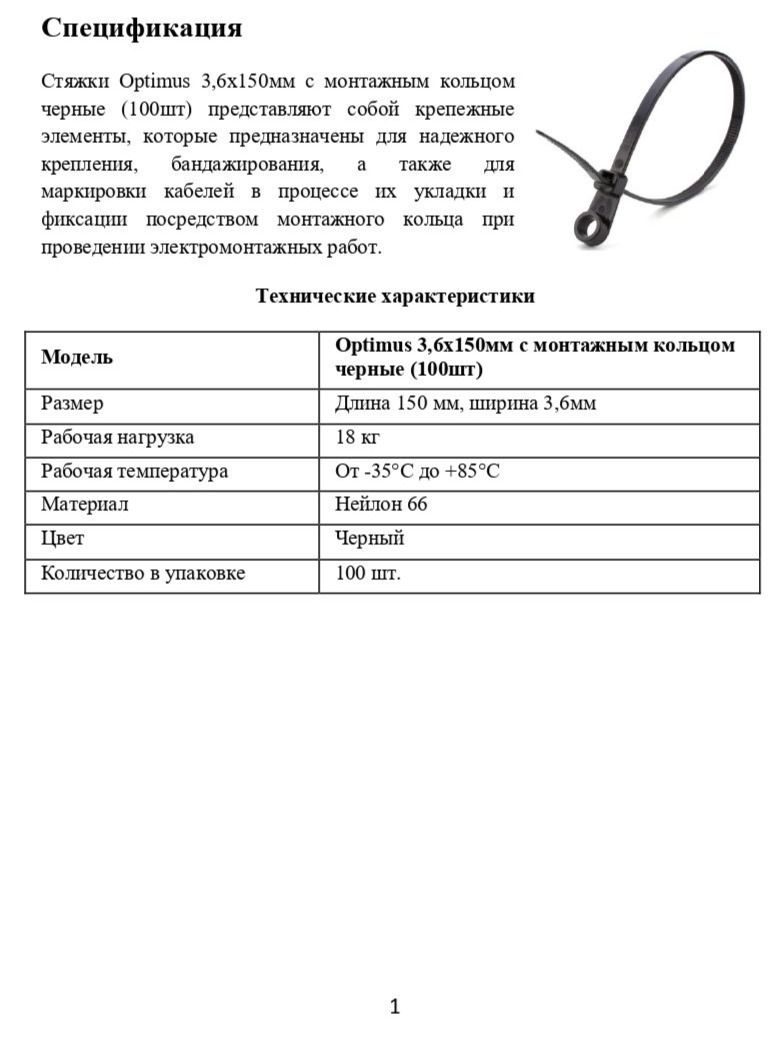 Стяжки Optimus 3,6x150мм с монтажным кольцом черные (100шт) представляют собой крепежные элементы, которые предназначены для надежного крепления, бандажирования, а также для маркировки кабелей в процессе их укладки и фиксации посредством монтажного кольца при проведении электромонтажных работ.