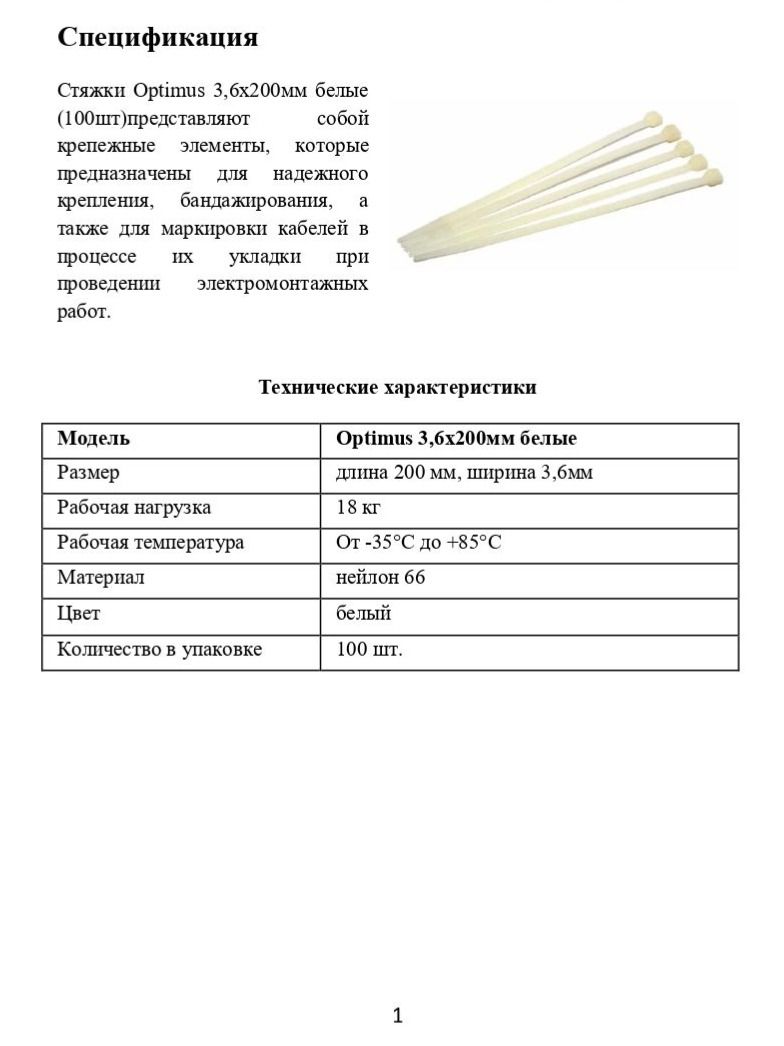 Стяжки Optimus 3,6x200мм белые (100шт) представляют собой крепежные элементы, которые предназначены для надежного крепления, бандажирования, а также для маркировки кабелей в процессе их укладки при проведении электромонтажных работ.
