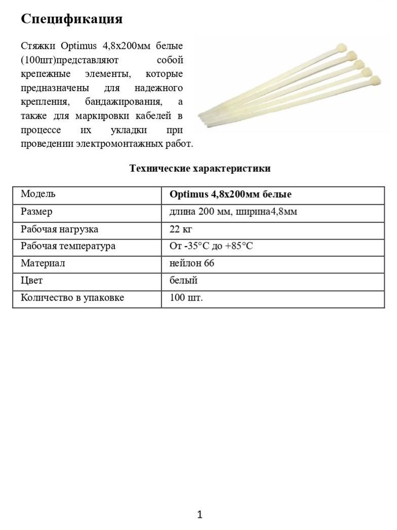 Стяжки Optimus 4,8x200мм белые (100шт) представляют собой крепежные элементы, которые предназначены для надежного крепления, бандажирования, а также для маркировки кабелей в процессе их укладки при проведении электромонтажных работ.