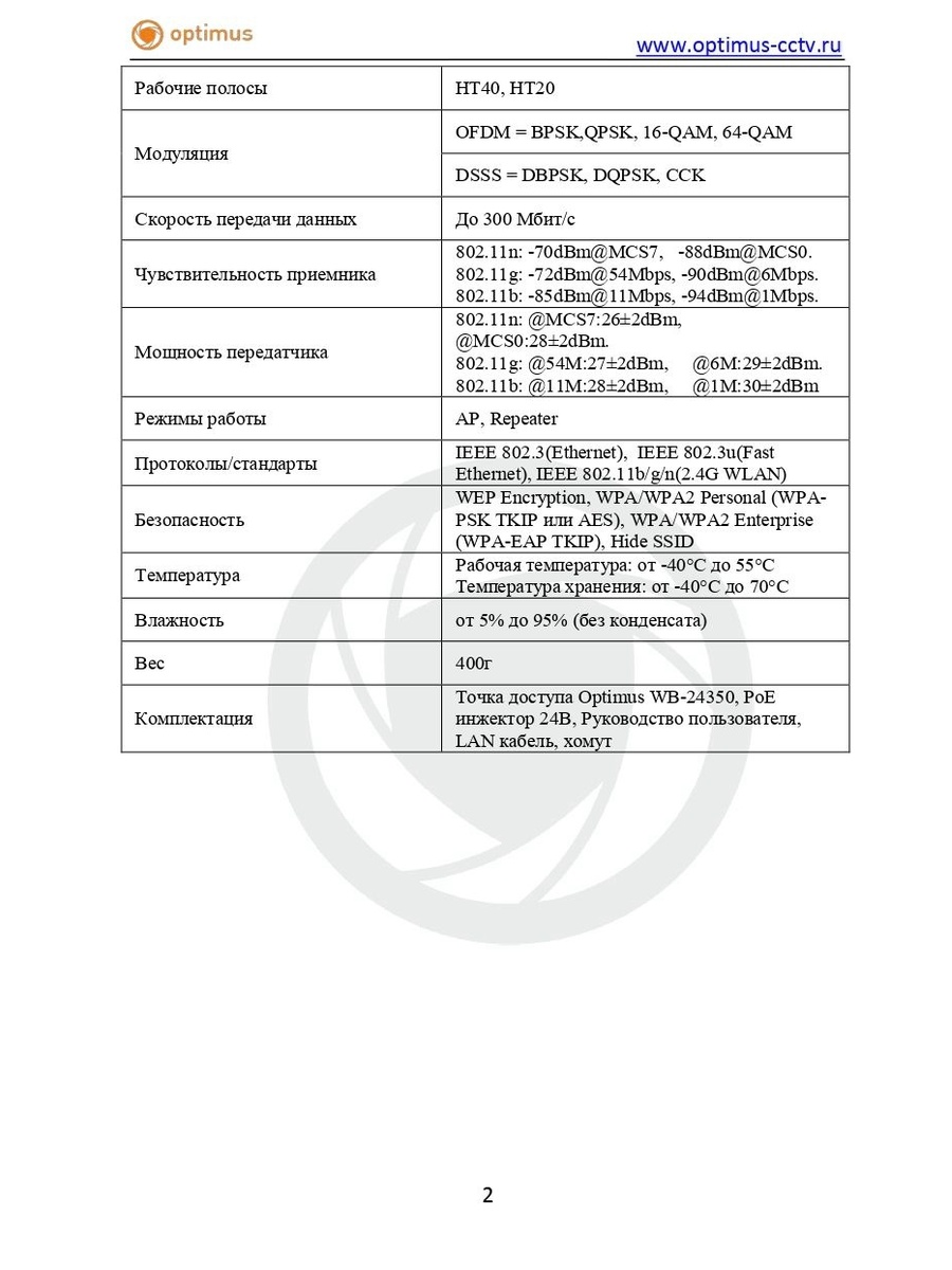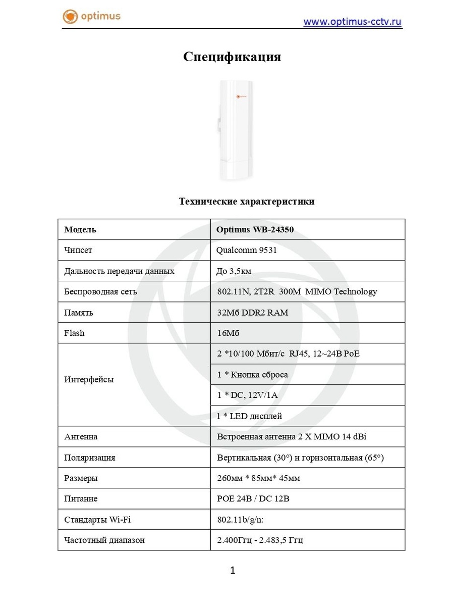 Беспроводная точка доступа Optimus WB-24350, поддерживает стандарты 802.11N, 2T2R 300M MIMO Technology. Устройство собрано на базе чипсета Qualcomm 9531. 2 X MIMO-антенна призвана обеспечить скорость 300 Мбит/с.