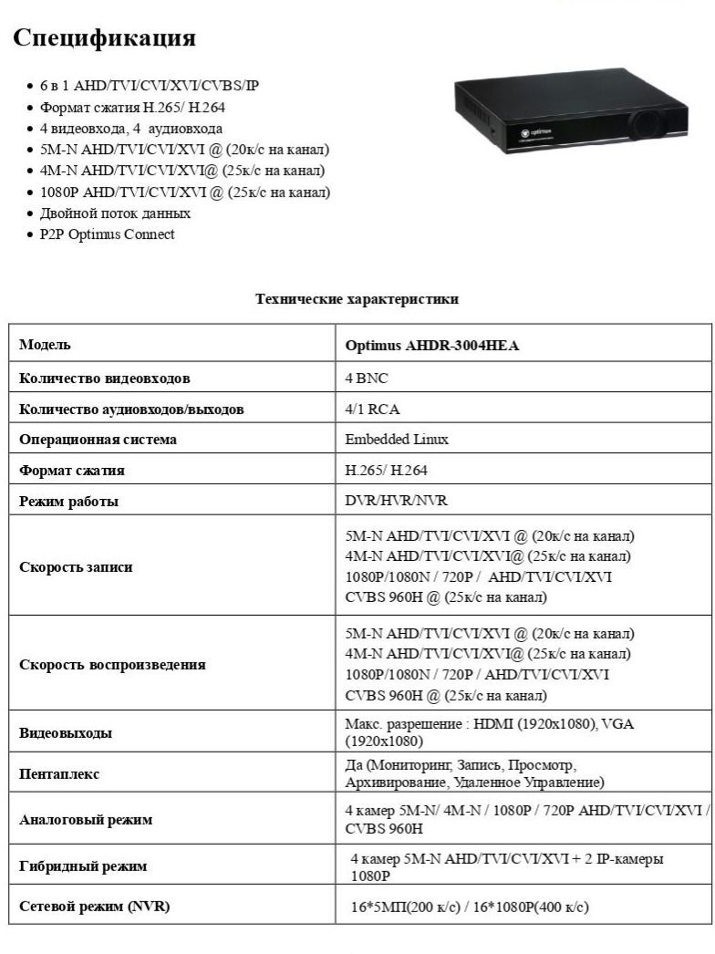 Гибридный видеорегистратор Optimus AHDR-3004HEA предназначен для работы с аналоговыми, цифровыми и сетевыми камерами (DVR/HVR/NVR) Позволяет подключить до 4 камер наблюдения. Видеорегистратор имеет следующие режимы работы: