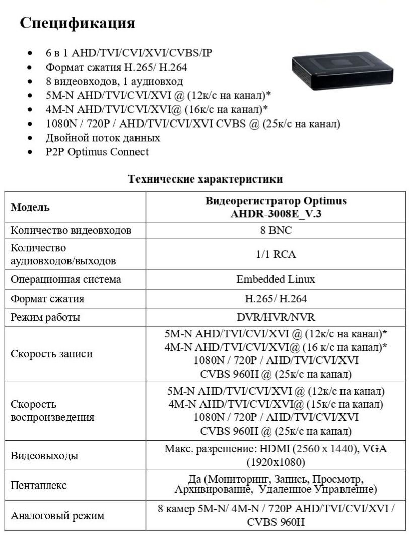 Гибридный 6 в 1 видеорегистратор Optimus AHDR-3008E_V.3 предназначен для работы с аналоговыми, цифровыми и сетевыми камерами (DVR/HVR/NVR) Позволяет подключить до 8 камер наблюдения.