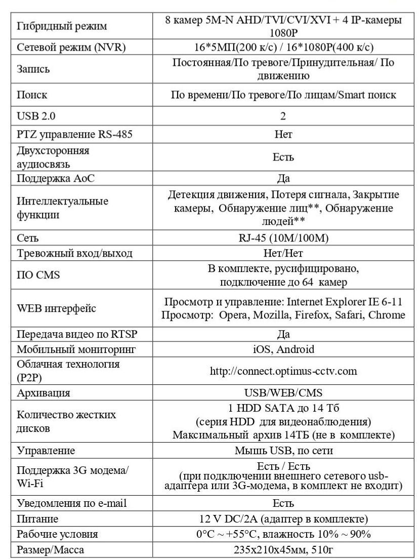 Аналоговый режим 8 камер 5M-N/ 4M-N / 720P AHD/TVI/CVI/XVI / CVBS 960Н