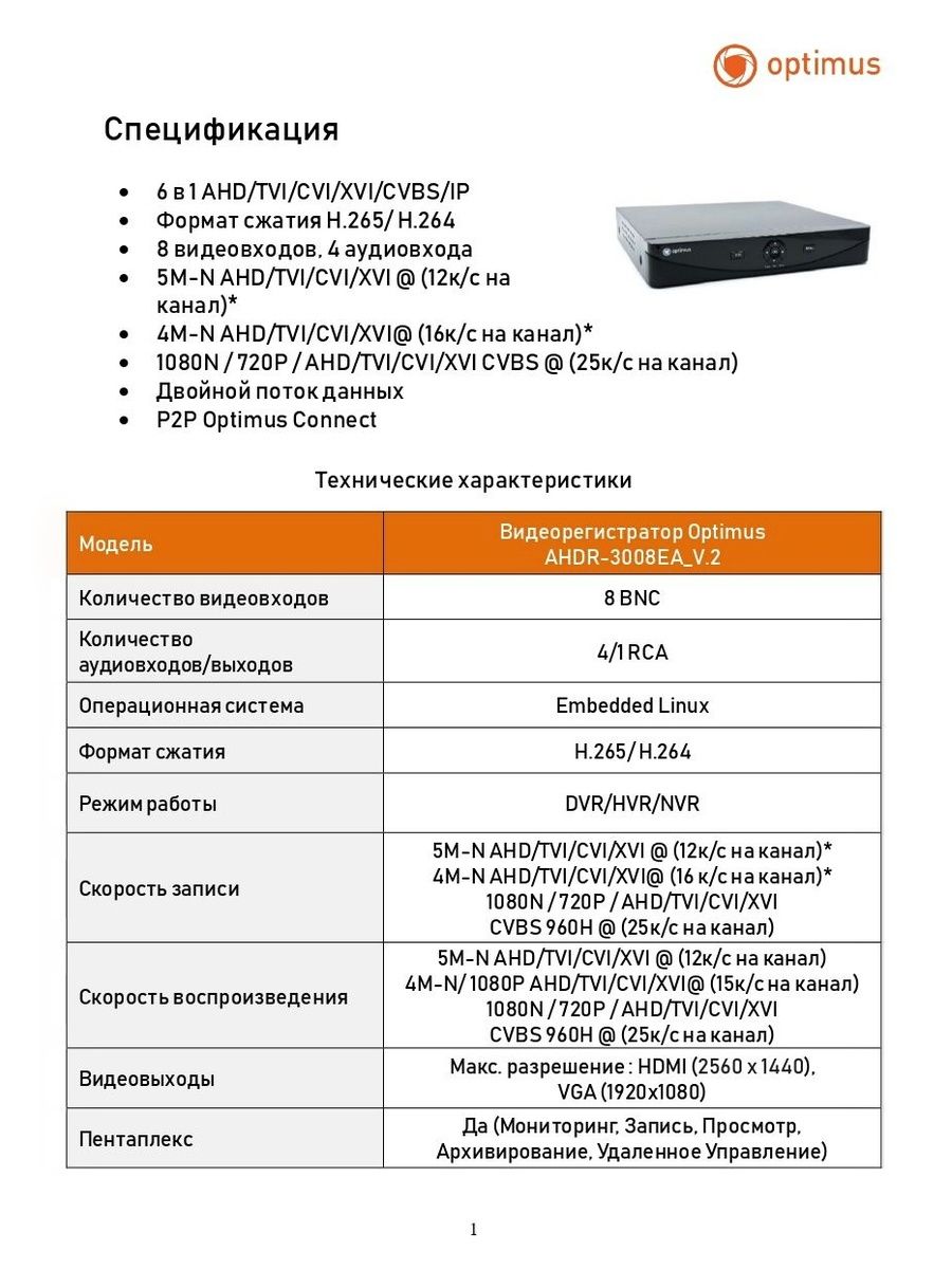 Гибридный 6 в 1 видеорегистратор Optimus AHDR-3008EA_V.1 предназначен для работы с аналоговыми, цифровыми и сетевыми камерами (DVR/HVR/NVR) Позволяет подключить до 8 камер наблюдения.
