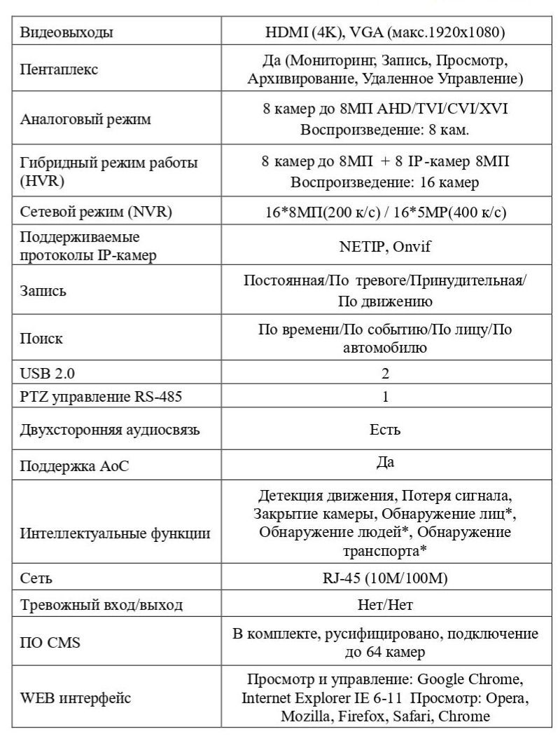 Гибридный режим работы (HVR) 8 камер до 8МП + 8 IP-камер 8MП Воспроизведение: 16камер