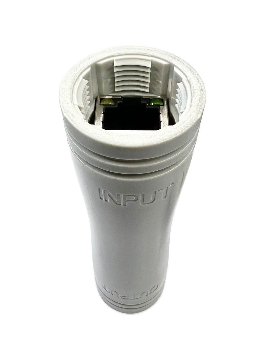 Удлинитель выполнен в пластиковом корпусе и имеет 2 разъема RJ-45: входной и выходной сетевой порт.