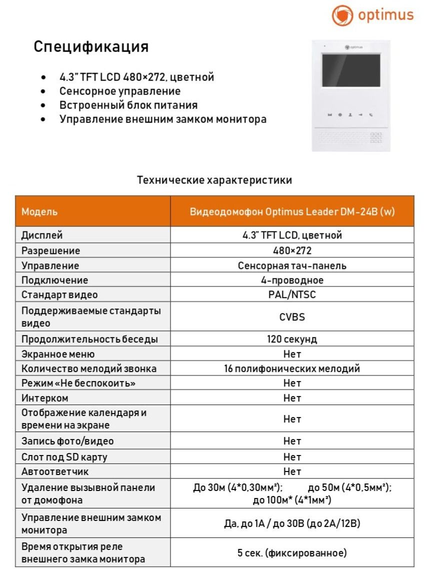 Видеодомофон Optimus Leader DM-24B (w) оснащен цветным ЖК-дисплеем с диагональю 4.3” и разрешением 480×272 пикселей, оборудован встроенным коммутационным реле с режимами работы Н.О. и Н.З. Есть возможность подключить до 2-х вызывных панелей Optimus Leader DSA-30IR (b)/Optimus Leader 2.0 DS-700R, до 2-х аналоговых камер*, встроенным блоком питания.