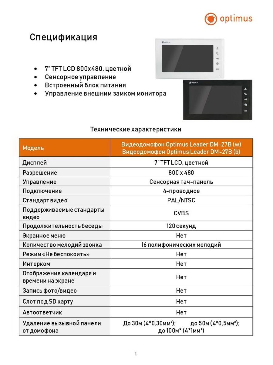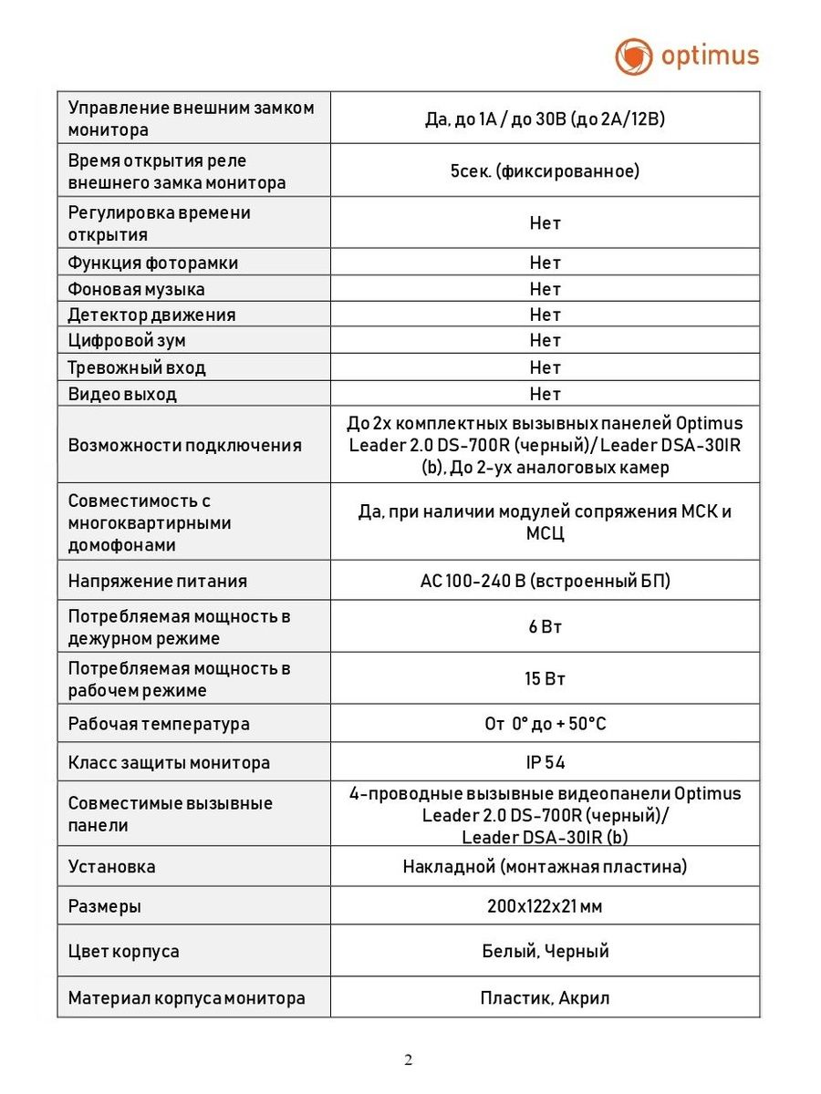 Расшифровка* Данная модель видеодомофона совместима со следующими моделями вызывных панелей Optimus: • Optimus Leader DSA-30IR (b) • Optimus Leader 2.0 DS-700R (черный)