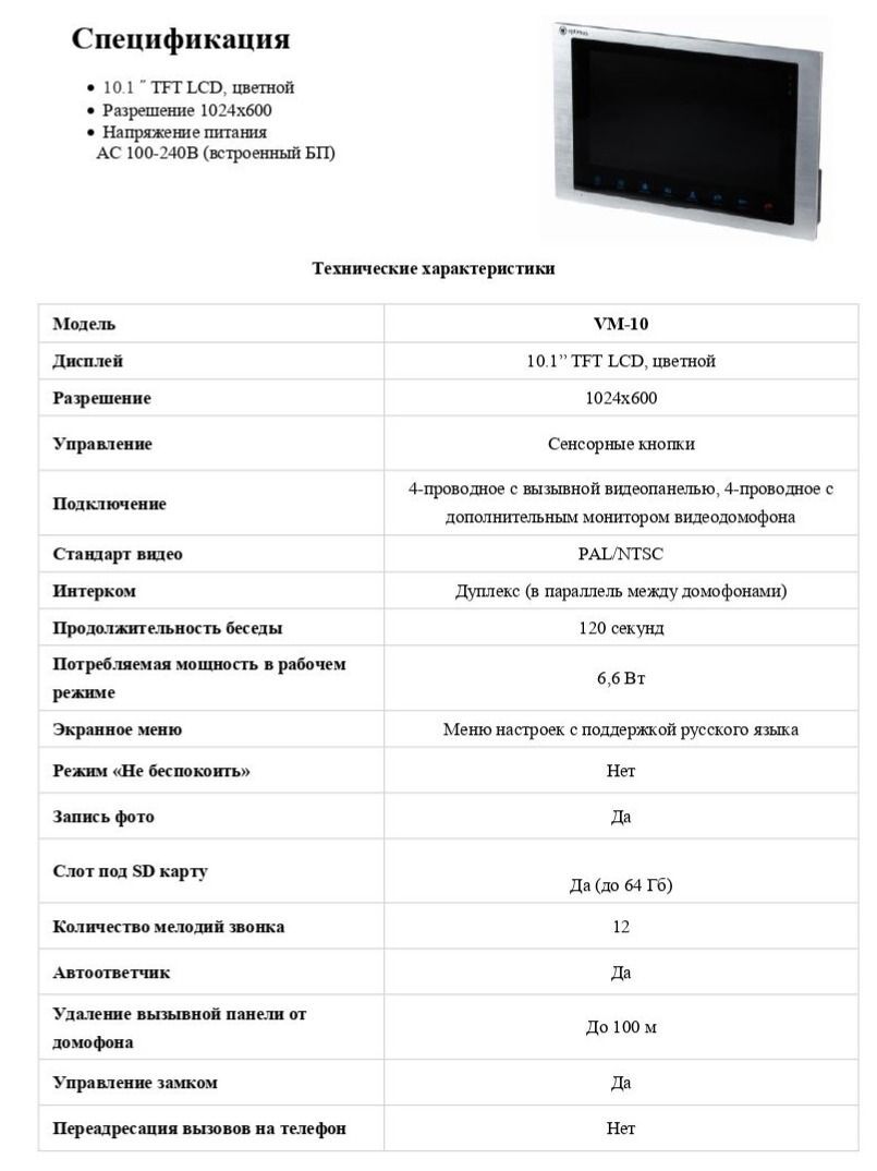Цветной монитор видеодомофона Optimus VM-10 оборудован 10.1”” TFT LCD дисплеем, с разрешением 1024x600 пикселей. Видеодомофон поддерживает стандарты видео PAL/NTSC. Связь между оператором и посетителем происходит в дуплексном режиме (в параллель между домофонами). Продолжительность беспрерывной беседы достигает 2 минут. Вызывная панель при этом может располагаться от видеодомофона на расстоянии до 100м. Управление домофоном производится при помощи сенсорных кнопок. Доступны функции записи фото и видео. Домофон поддерживает SD-карты, объемом до 64 Гб. На одну такую карту может быть записано ~32 тыс. фото или около 18-ти часов видео. К домофону возможно подключить до 2х вызывных панелей, до 4х мониторов, до 2х аналоговых камер. С монитором совместимы 4-проводные вызывные видеопанели.