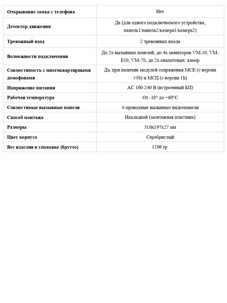 Возможности подключения До 2х вызывных панелей, до 4х мониторов VM-10 или VM-7S, до 2х аналоговых камер