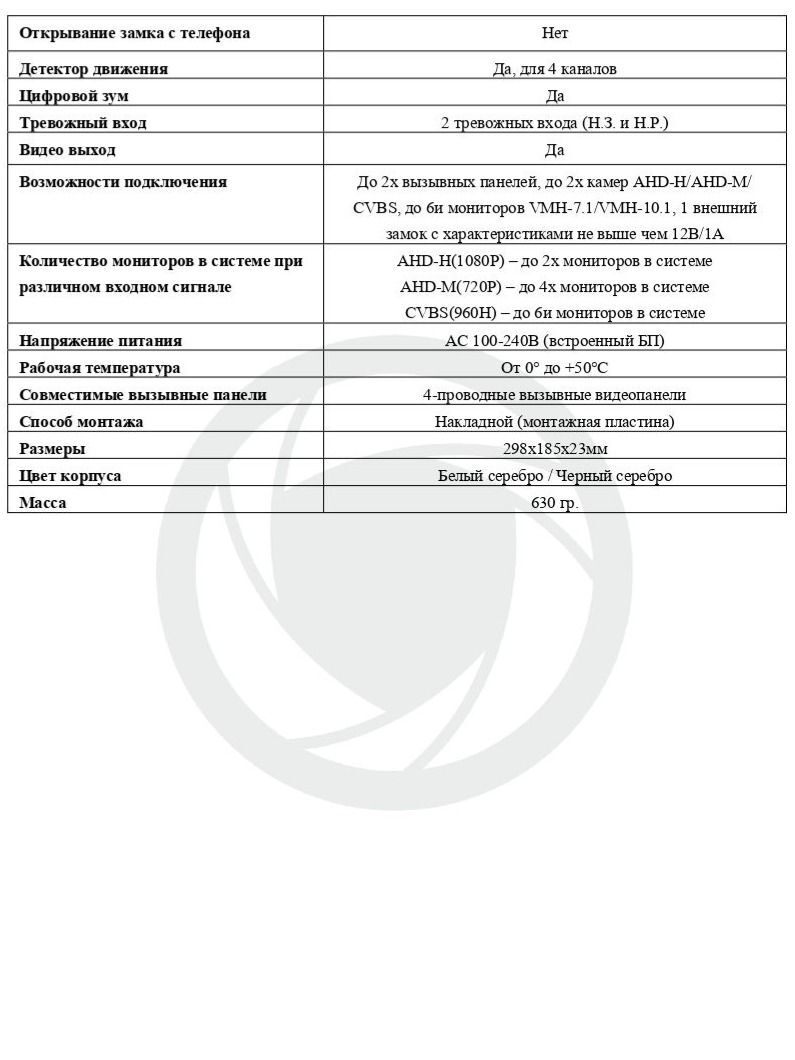 10” TFT LCD, цветной, разрешение 1024x600, поддержка стандартов AHD/TVI/CVI/CVBS, продолжительность беседы 120 сек., Запись видео в разрешении 1920х1080, п4-проводное с вызывной видеопанелью, 4-проводное с дополнительным монитором видеодомофона, 3-проводное с внешним замком, управление сенсорные кнопки, экранное меню с поддержкой русского языка, запись фото/видео, автоответчик, детектор движения. Возможности подключения до 2х вызывных панелей, до 2х камер AHD-H/AHD-M/CVBS, до 6х мониторов VMH-7.1/VMH-10.1. Управление замком, SD-card до 128 Гб (10 класс или выше), напряжение питания AC 100-240 В (встроенный БП), рабочая температура 0°С до +50°С, размер 248х181х23мм, 630 гр. Монтаж накладной (монтажная пластина).
