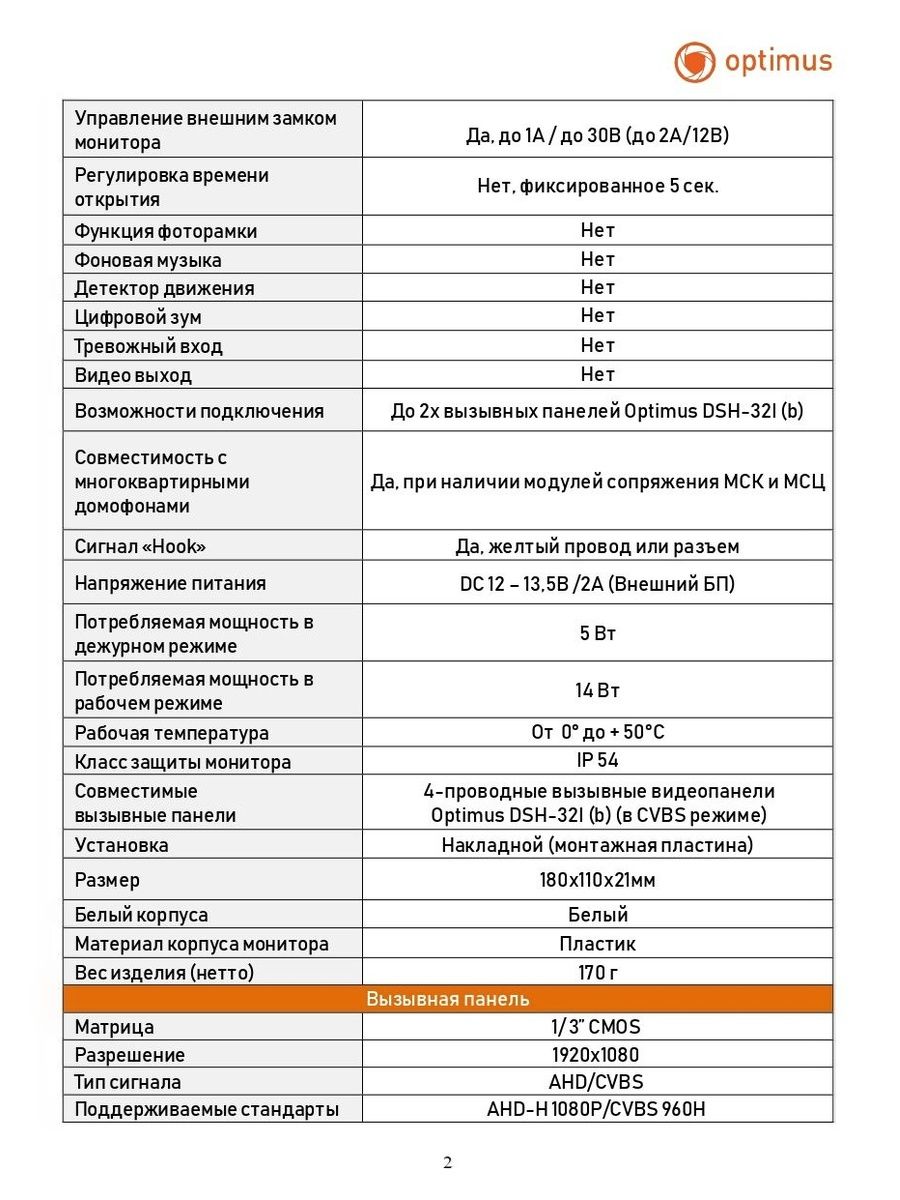 Возможности подключения До 2х вызывных панелей Optimus DSH-32I (b)