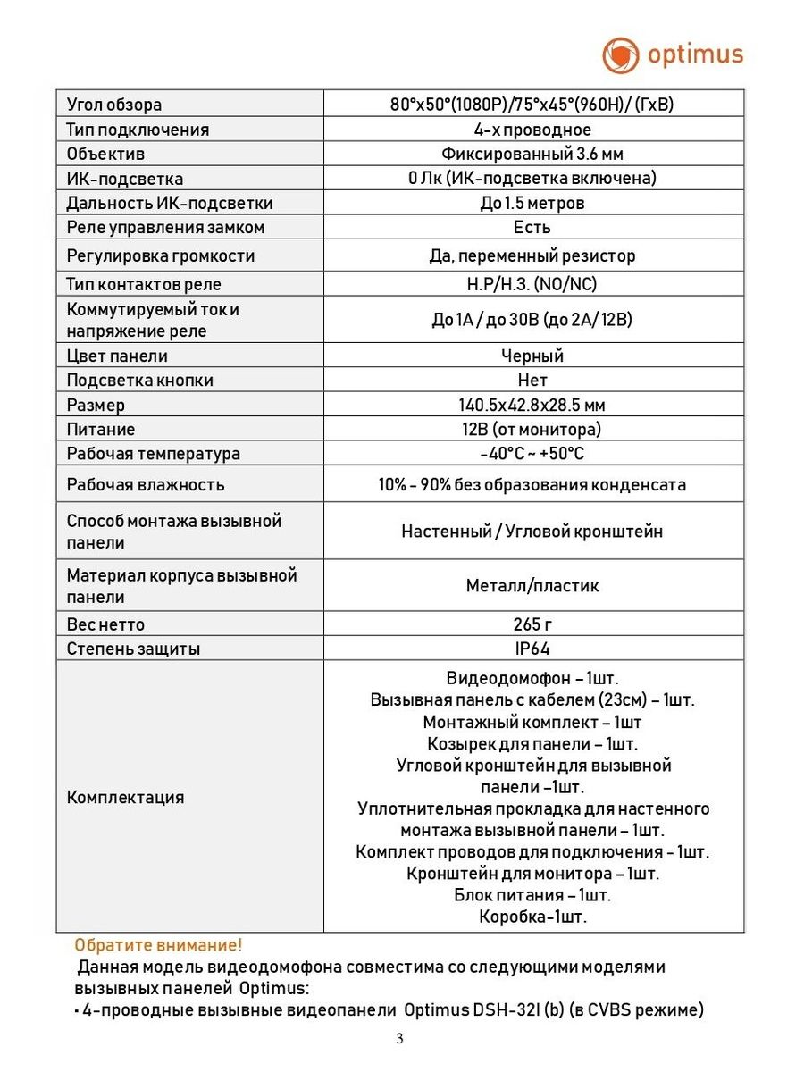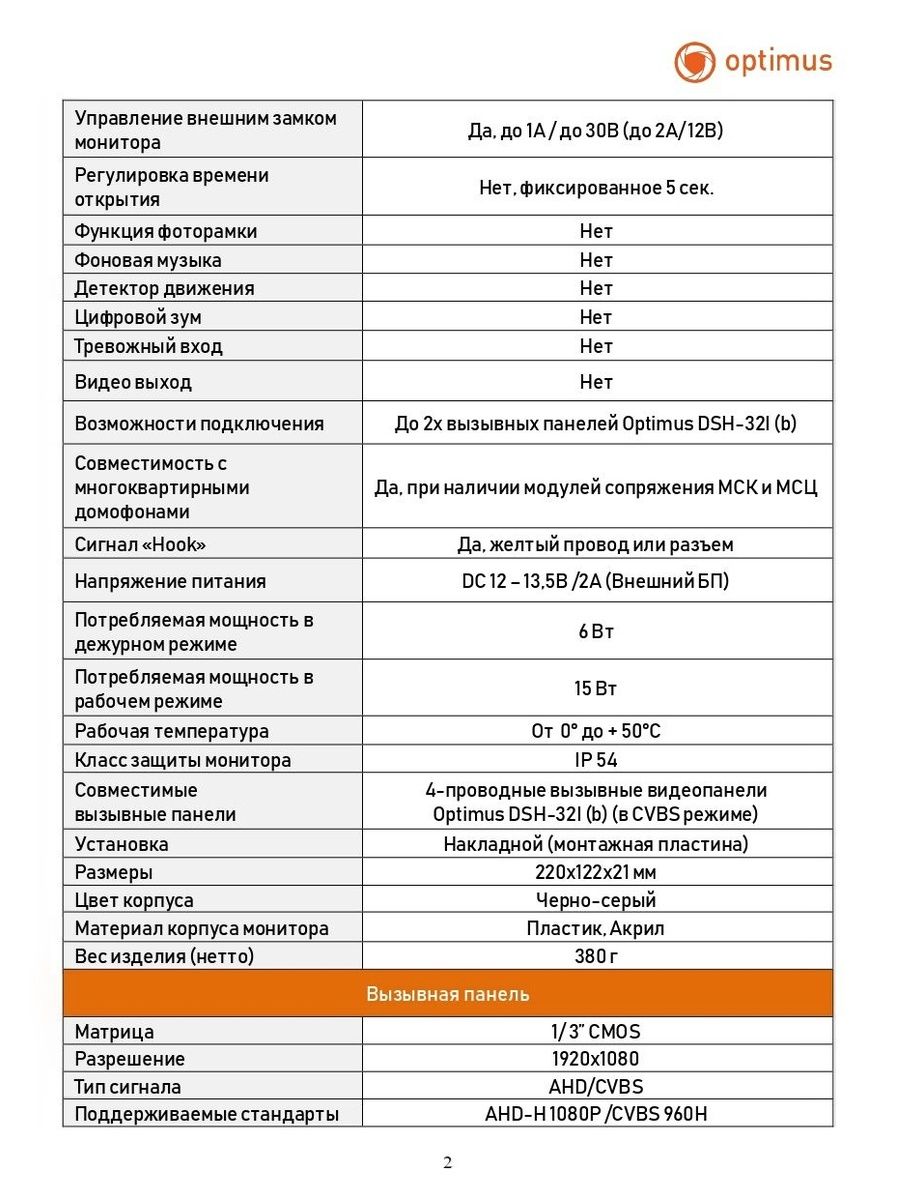 Возможности подключения До 2х вызывных панелей Optimus DSH-32I (b)