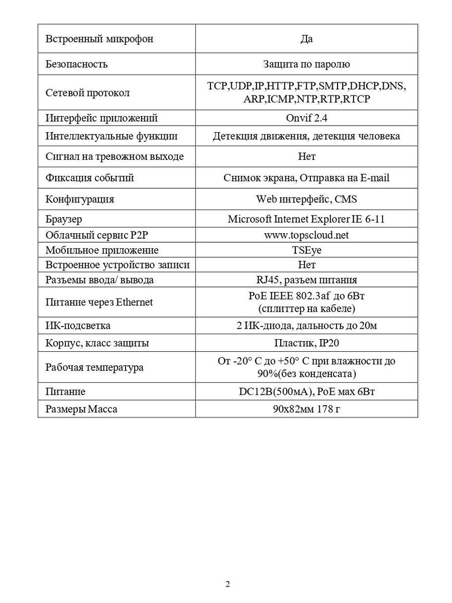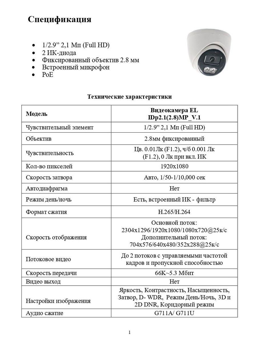 1/2.9” 2,1 Мп (Full HD); 2 ИК-диода; Фиксированный объектив 2.8 мм; Встроенный микрофон; PoE