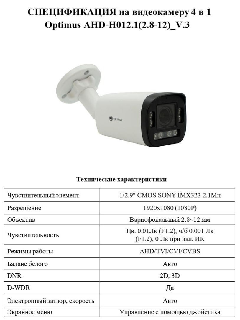 В основе камеры Optimus AHD-H012.1(2.8-12)_V.3 лежит чувствительный элемент CMOS SONY IMX323 диагональю 1/2.9" и разрешением 2.1 Мп. Камера позволяет получать качественное изображение высокого разрешения 1920х1080 пикселей. Модель оборудована варифокальным объективом 2.8~12 мм. Чувствительность камеры в цветном режиме - 0,01 Лк, в черно-белом - 0 Лк.