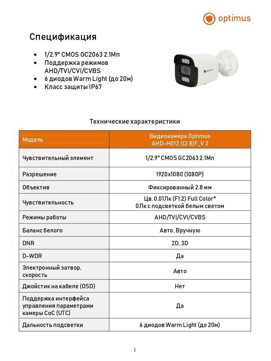 видеокамера optimus ahd-h012.1