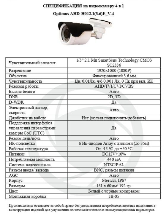 В основе камеры Optimus AHD-H012.1(3.6)E_V.4 лежит чувствительный элемент SmartSens Technology CMOS SC2336 диагональю 1/3" и разрешением 2.1 Мп. Камера позволяет получать качественное изображение высокого разрешения 1920х1080 пикселей. Модель оборудована фиксированным объективом 3.6 мм. Чувствительность камеры в цветном режиме - 0,01 Лк, в черно-белом - 0,001 Лк.