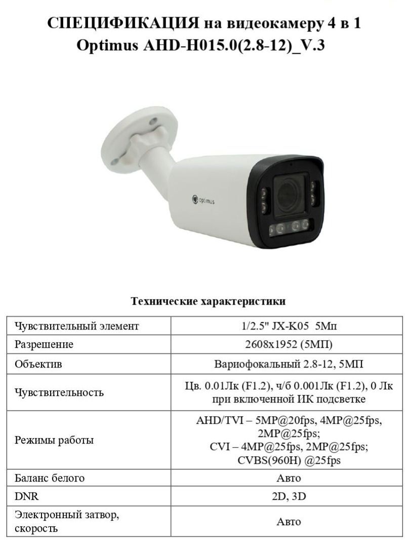 В основе камеры Optimus AHD-H015.0(2.8-12)_V.3 лежит чувствительный элемент производства JX-K05 диагональю 1/2.5" и разрешением 5 Мп. Камера позволяет получать качественное изображение высокого разрешения 2608х1952 пикселей. Модель оборудована вариофокальным объективом 2.8-12 мм. Чувствительность камеры 0.01Лк (F1.2), ч/б 0.001Лк (F1.2), 0 Лк при включенной ИК подсветке.