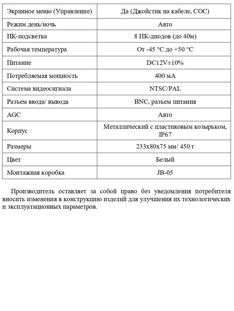 Питание камеры - DC12V±10%. Управление возможно при помощи джойстика через экранное меню.