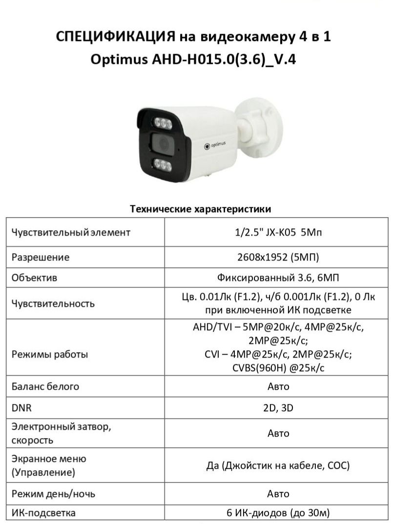 В основе камеры Optimus AHD-H015.0(3.6)_V.4 лежит чувствительный элемент производства JX-K05 диагональю 1/2.5" и разрешением 5 Мп. Камера позволяет получать качественное изображение высокого разрешения 2608х1952 пикселей. Модель оборудована фиксированным объективом 3.6 мм. Чувствительность камеры 0.01Лк (F1.2), ч/б 0.001Лк (F1.2), 0 Лк при включенной ИК подсветке.