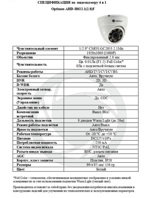 В основе камеры Optimus AHD-H022.1(2.8)F лежит чувствительный элемент CMOS GC2053 диагональю 1/2.9" и разрешением 2.1 Мп. Камера позволяет получать качественное изображение высокого разрешения 1920х1080 пикселей. Модель оборудована фиксированным объективом 2.8 мм. Чувствительность камеры составляет цв. 0.01Лк (F1.2) Full Color* 0Лк с подсветкой белым светом.