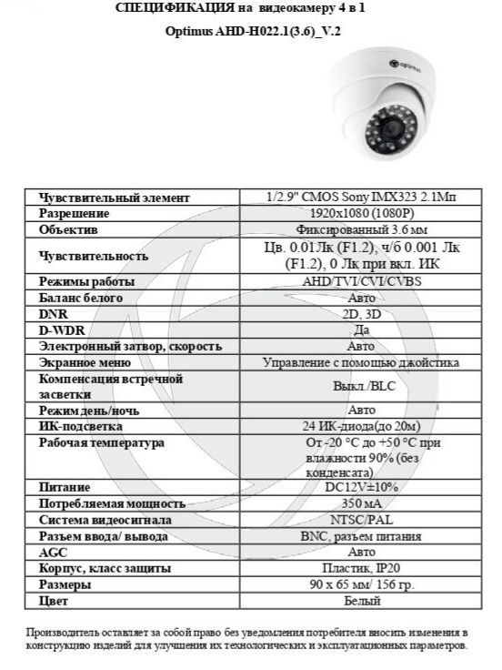 В основе камеры Optimus AHD-H022.1(3.6)_V.2 лежит чувствительный элемент CMOS Sony IMX323 диагональю 1/2.9" и разрешением 2.1 Мп. Камера позволяет получать качественное изображение высокого разрешения 1920х1080 пикселей. Модель оборудована фиксированным объективом 3.6 мм.
