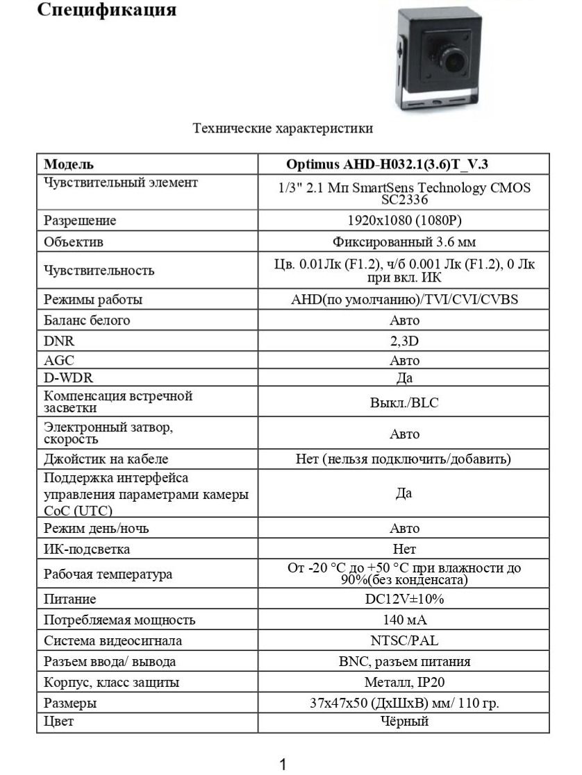 В основе камеры Optimus AHD-H032.1(3.6)T_V.3 лежит чувствительный элемент SmartSens Technology CMOS SC2336 диагональю 1/3" и разрешением 2.1 Мп. Камера позволяет получать качественное изображение высокого разрешения 1920х1080 пикселей. Модель оборудована фиксированным объективом 3.6 мм. Чувствительность камеры цв. 0.01Лк (F1.2), ч/б 0.001 Лк (F1.2), 0 Лк при вкл. ИК