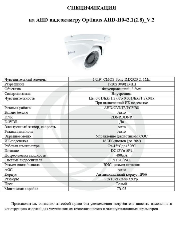 В основе камеры Optimus AHD-H042.1(2.8)_V.2 лежит чувствительный элемент CMOS диагональю 1/2.9" и разрешением 2.1 Мп. Камера позволяет получать качественное изображение высокого разрешения 1920х1080 пикселей. Модель оборудована фиксированным объективом 2.8 мм. Чувствительность камеры в цветном режиме составляет 0,01 Лк, в ч/б 0,001 Лк.