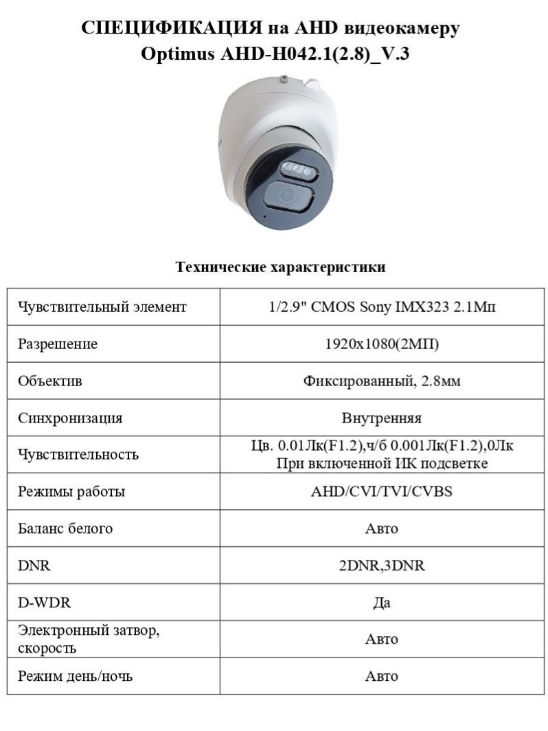 В основе камеры Optimus AHD-H042.1(2.8)_V.3 лежит чувствительный элемент CMOS диагональю 1/2.9" и разрешением 2.1 Мп. Камера позволяет получать качественное изображение высокого разрешения 1920х1080 пикселей. Модель оборудована фиксированным объективом 2.8 мм. Чувствительность камеры в цветном режиме составляет 0,01 Лк, в ч/б 0,001 Лк.