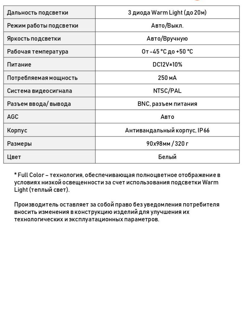 Расшифровка *Full Color – технология, обеспечивающая полноцветное отображение в условиях низкой освещенности за счет использования подсветки Warm Light (теплый свет).
