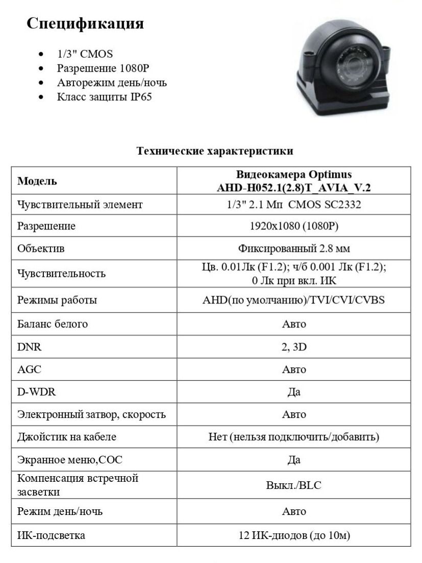В основе камеры Optimus AHD-H052.1(2.8)T_AVIA_V.2 лежит чувствительный элемент SmartSens Technology CMOS SC2332 диагональю 1/3" и разрешением 2.1 Мп. Камера позволяет получать качественное изображение высокого разрешения 1920х1080 пикселей. Модель оборудована фиксированным объективом 2.8 мм. Чувствительность камеры цв. 0.01Лк (F1.2); ч/б 0.001 Лк (F1.2); 0 Лк при вкл. ИК.