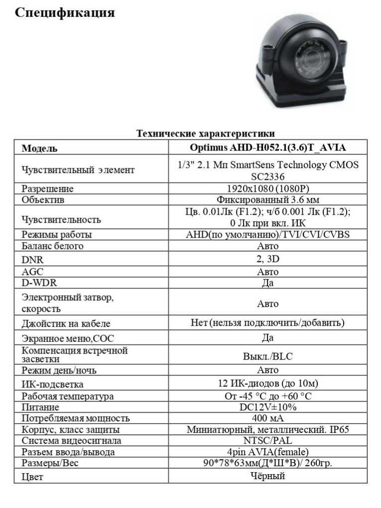 В основе камеры Optimus AHD-H052.1(3.6)T_AVIA лежит чувствительный элемент SmartSens Technology CMOS SC2336 диагональю 1/3" и разрешением 2.1 Мп. Камера позволяет получать качественное изображение высокого разрешения 1920х1080 пикселей. Модель оборудована фиксированным объективом 3.6 мм. Чувствительность камеры цв. 0.01Лк (F1.2); ч/б 0.001 Лк (F1.2); 0 Лк при вкл. ИК.