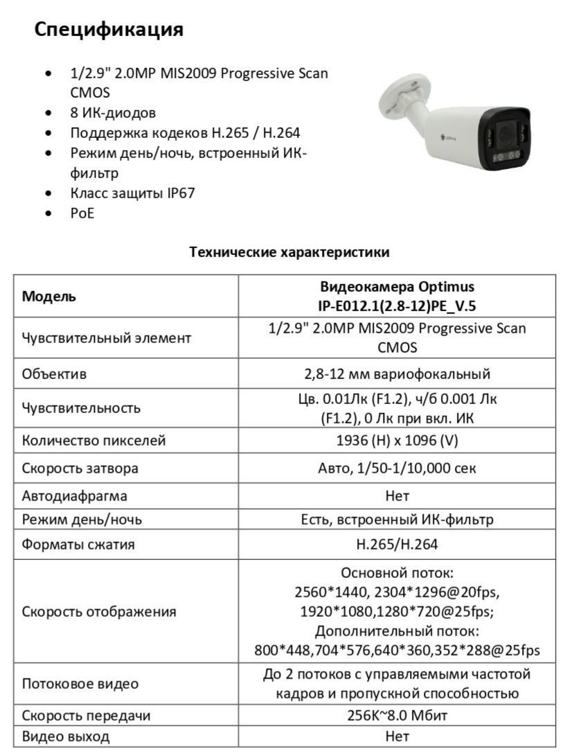 Уличная IP-видеокамера Optimus IP-E012.1(2.8-12)PE_V.5 создана на основе 1/2.9" матрицыMIS2009 Progressive Scan CMOS, разрешением 2 Мп