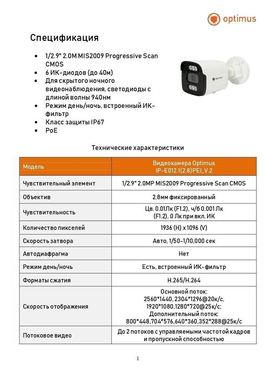 Видеокамера Optimus IP-E012.1(2.8)PEI_V.2
