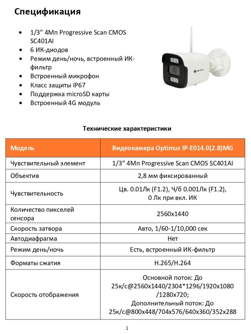 Уличная IP-видеокамера Optimus IP-E014.0(2.8)MG создана на основе 1/3” 4Мп Progressive Scan CMOS SC401AI.