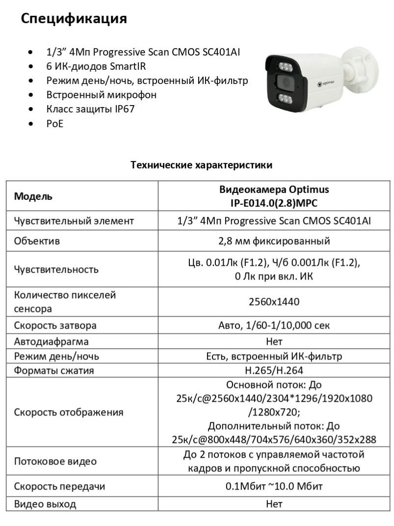 Видеокамера Optimus IP-E014.0(2.8)MPC