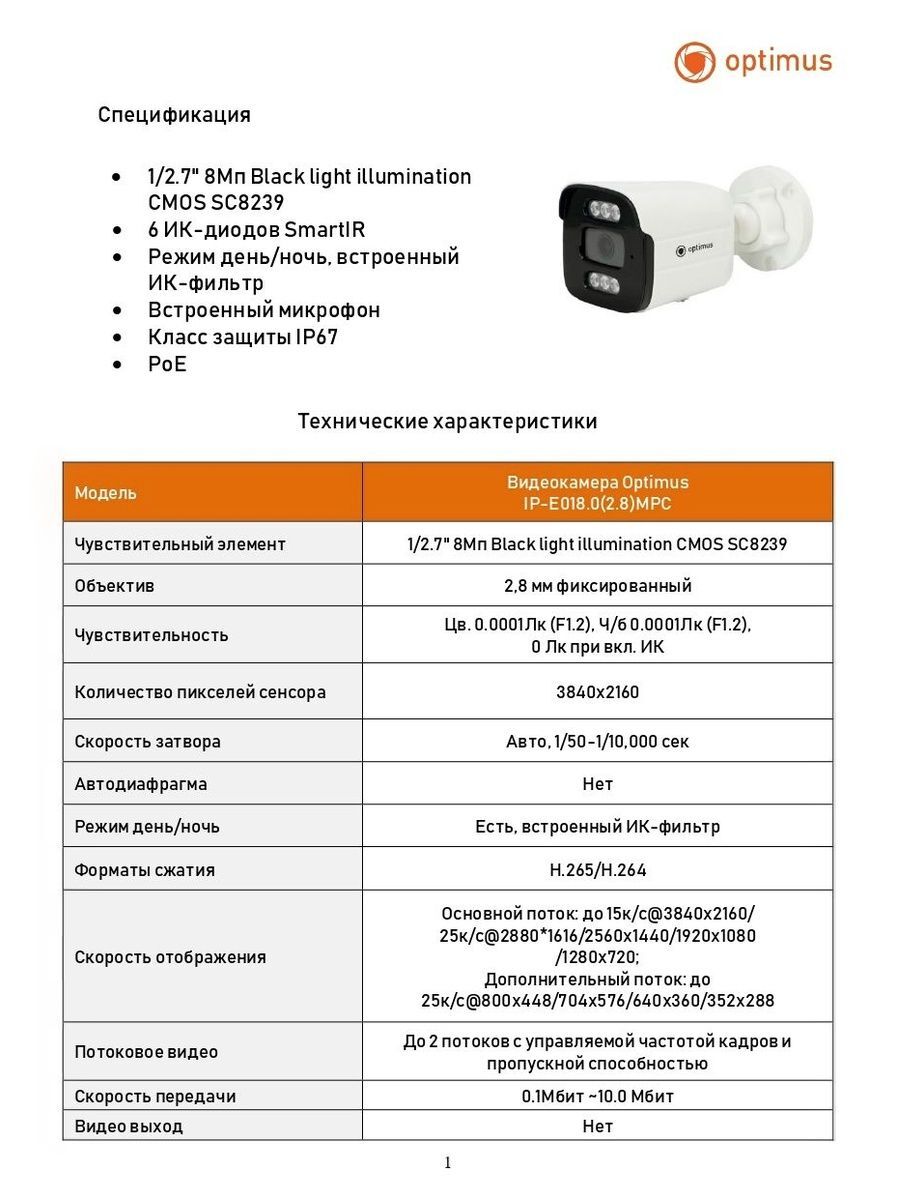 Уличная IP-видеокамера Optimus IP-E018.0(2.8)MPC создана на основе 1/2.7" 8Мп Black light illumination CMOS SC8239.