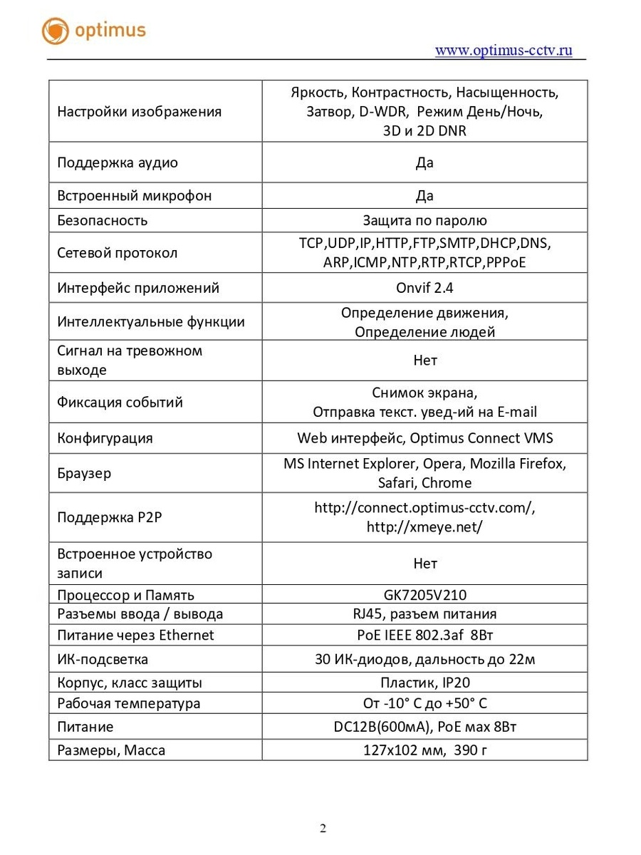 Камера выполнена в пластиковом корпусе степенью защиты IP20. Рабочая температура от -10° С до +50° С.