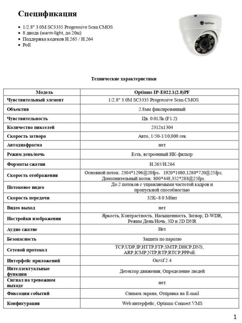 Внутренняя IP-видеокамера Optimus IP-E022.1(2.8)PF создана на основе 1/2.8" 3.0M SC3335 Progressive Scan CMOS.