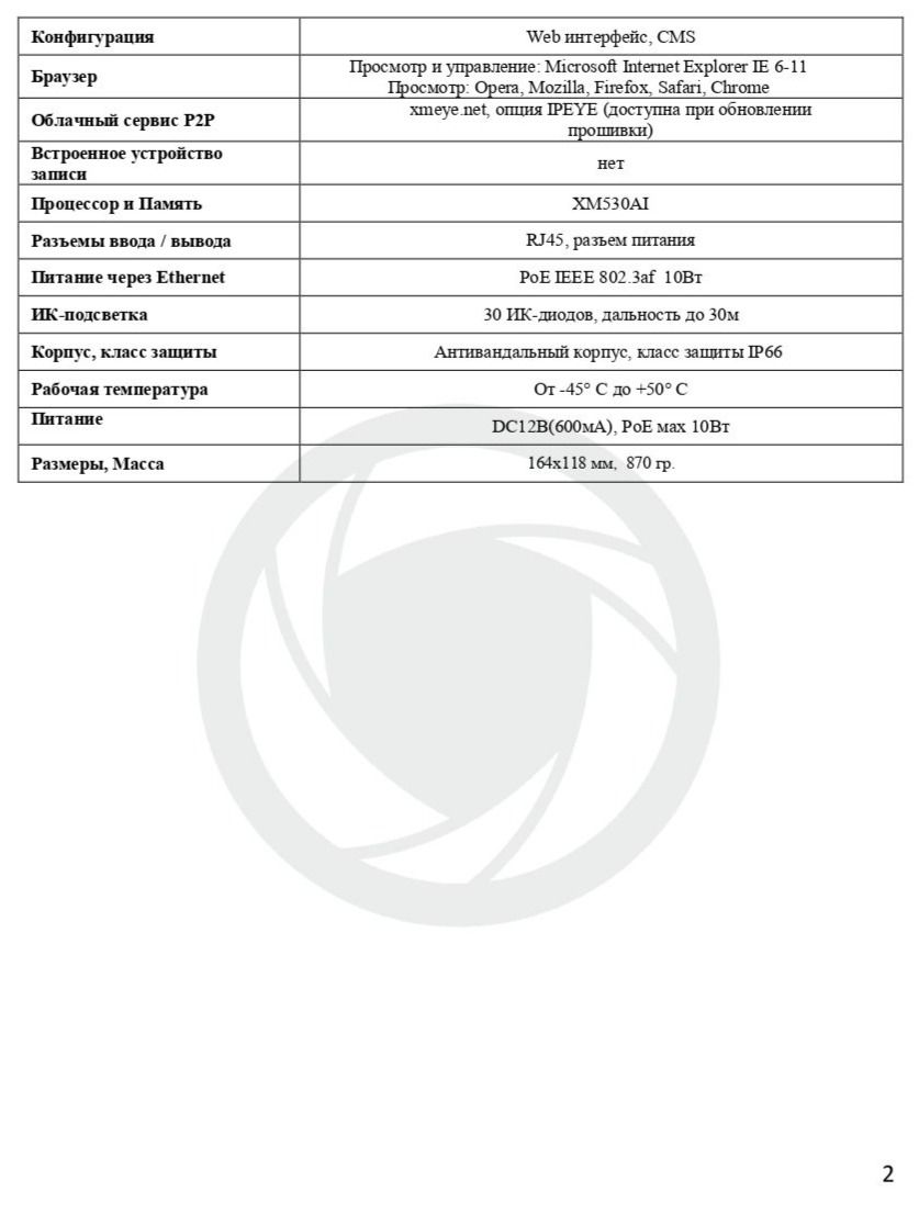 Камера выполнена в антивандальном корпусе степенью защиты IP66. Рабочая температура от -45°С до +50°С.