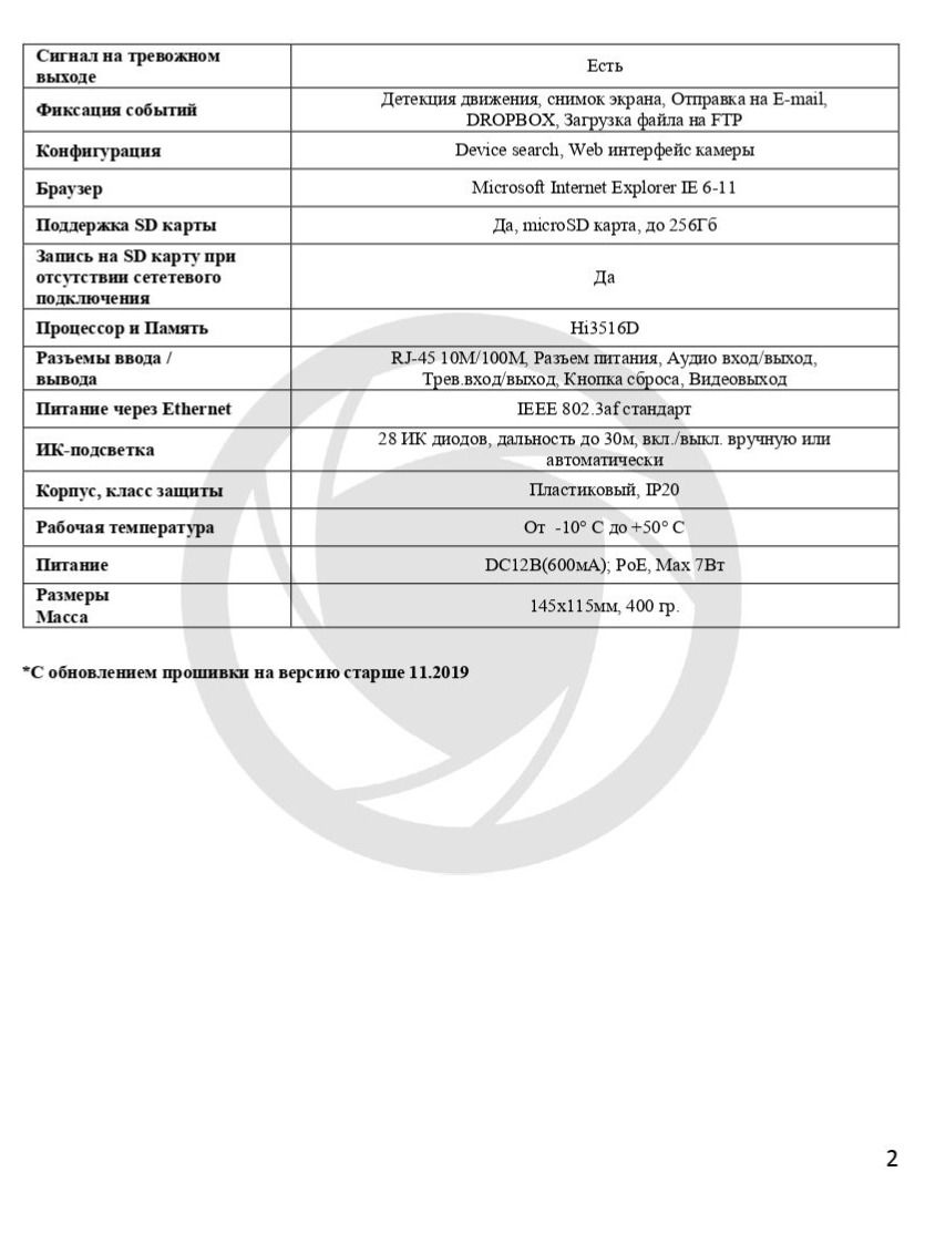 Камера выполнена в пластиковом корпусе со степенью защиты IP20. Рабочая температура от -10°С до +50°С.