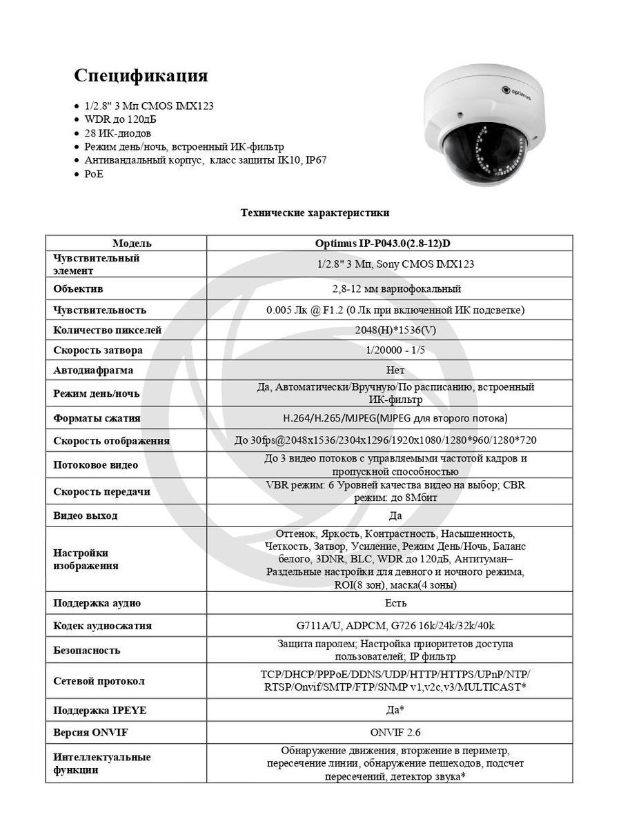 Уличная IP-видеокамера IP-P043.0(2.8-12)D создана на основе 1/2.8" матрицы CMOS IMX123 Starvis, разрешением 3 Мп (2048х1536). Оборудована вариофокальным 2,8-12 мм объективом, встроенным ИК-фильтром.