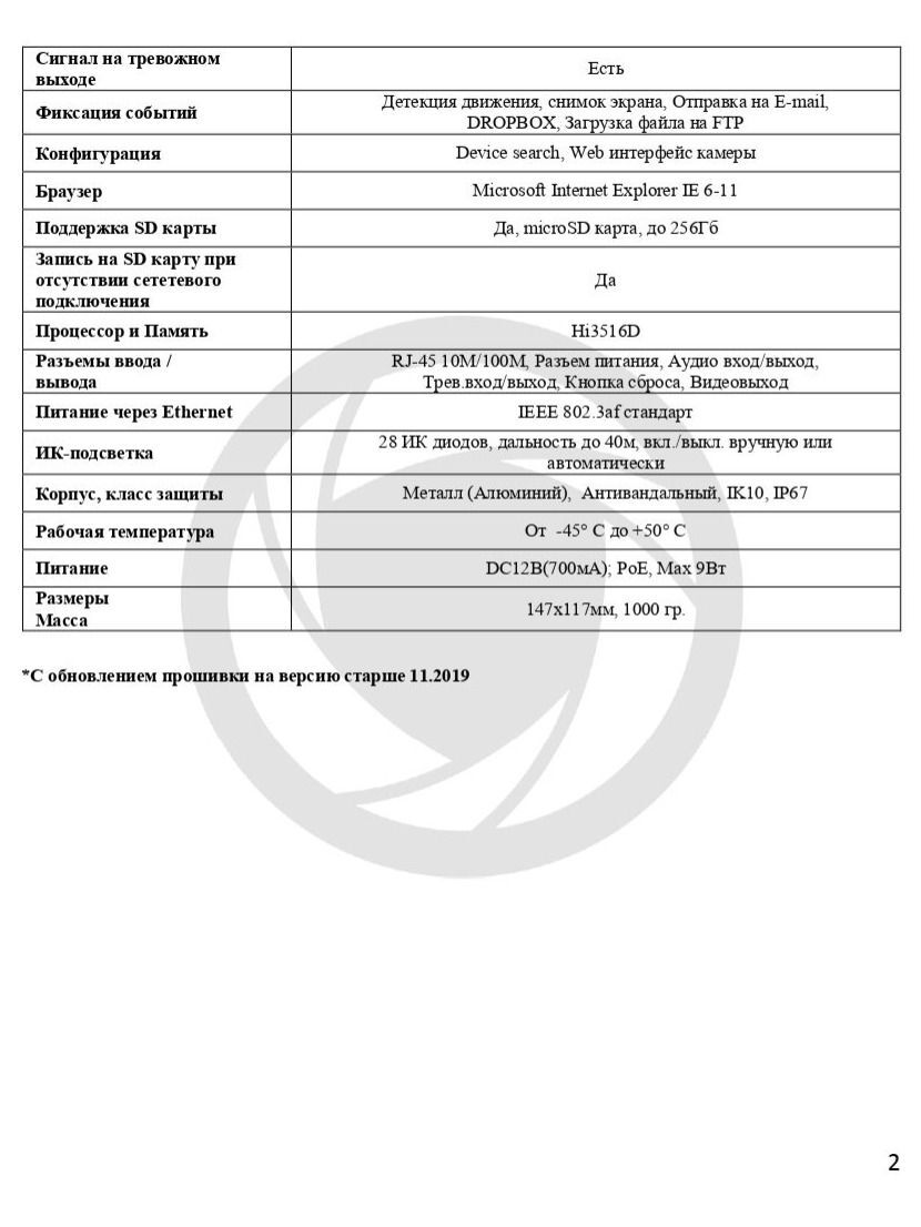 Камера выполнена в металлическом антивандальном корпусе со степенью защиты IP67. Рабочая температура от -45°С до +50°С.