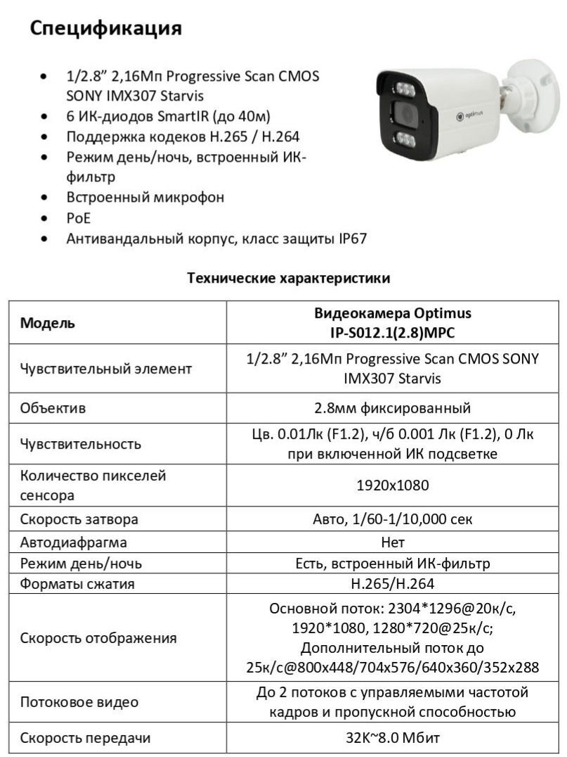Уличная IP-видеокамера Optimus IP-S012.1(2.8)MPС создана на основе 1/2.8” 2,16Мп Progressive Scan CMOS SONY IMX307 Starvis.