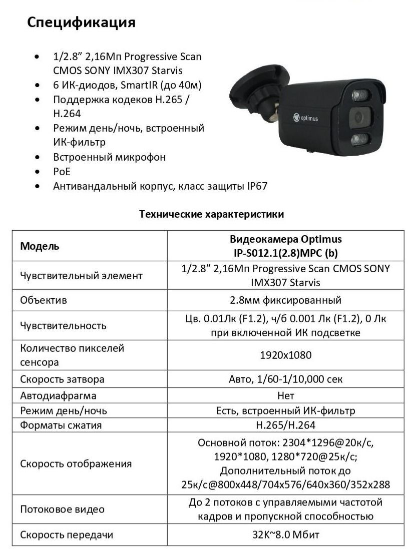 Уличная IP-видеокамера Optimus IP-S012.1(2.8)MPС (b) создана на основе 1/2.8” 2,16Мп Progressive Scan CMOS SONY IMX307 Starvis.