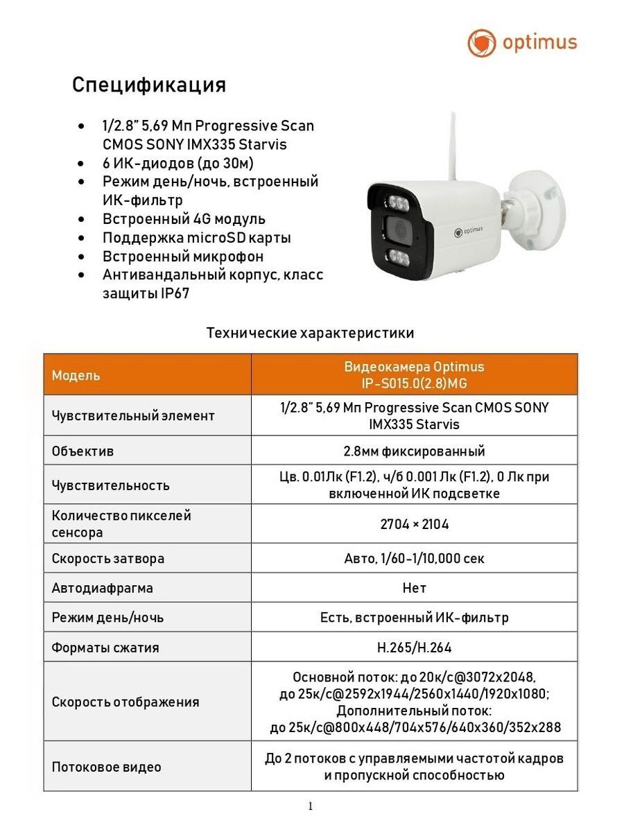 Уличная IP-видеокамера Optimus IP-S015.0(2.8)MG создана на основе 1/2.8” 5,69 Мп Progressive Scan CMOS SONY IMX335 Starvis.