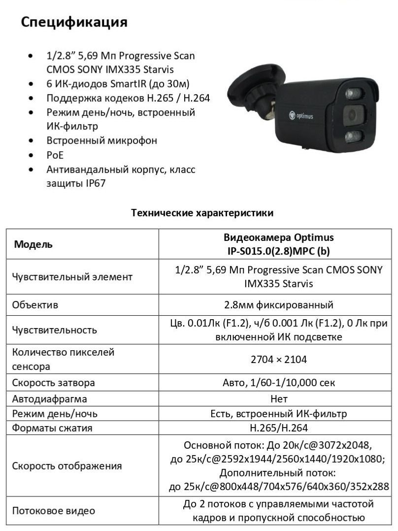 Уличная IP-видеокамера Optimus IP-S015.0(2.8)MPC (b) создана на основе 1/2.8” 5,69 Мп Progressive Scan CMOS SONY IMX335 Starvis.