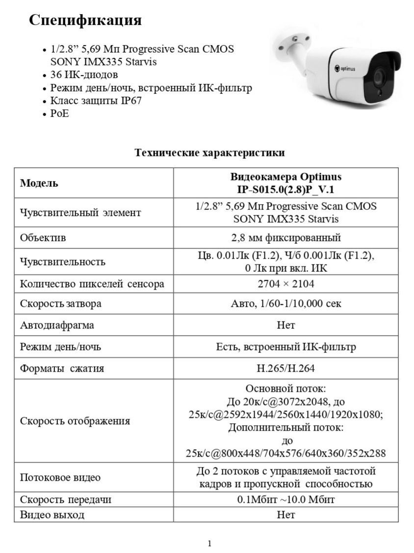 Уличная IP-видеокамера Optimus IP-S015.0(2.8)P_V.1 создана на основе 1/2.8” 5,69 Мп Progressive Scan CMOS SONY IMX335 Starvis.