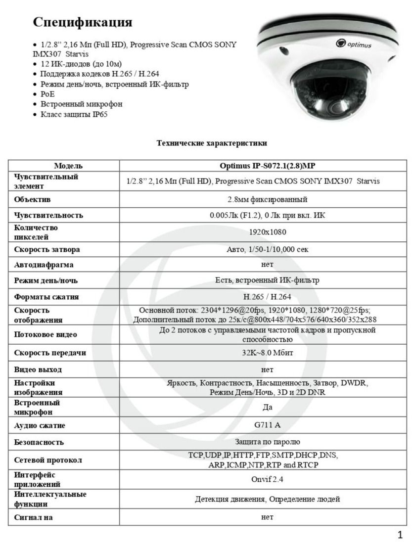Купольная IP-видеокамера IP-S072.1(2.8)MP создана на основе 1/2.8” 2,16 Мп (Full HD) Progressive Scan CMOS SONY IMX307 Starvis.